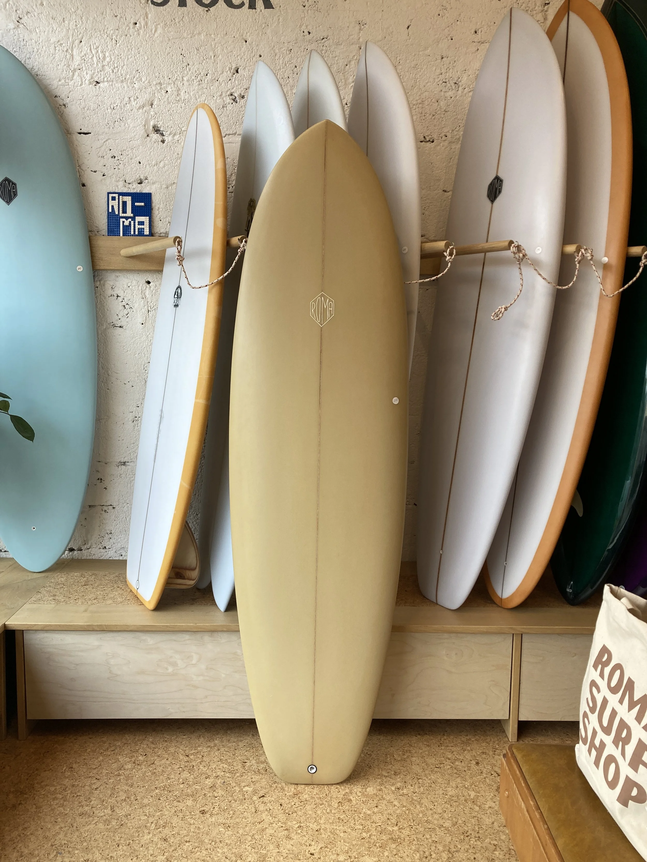 This thruster (also 6’ 4”) follows the original template and was shaped at 21 1/8” which is what we would consider “stock”